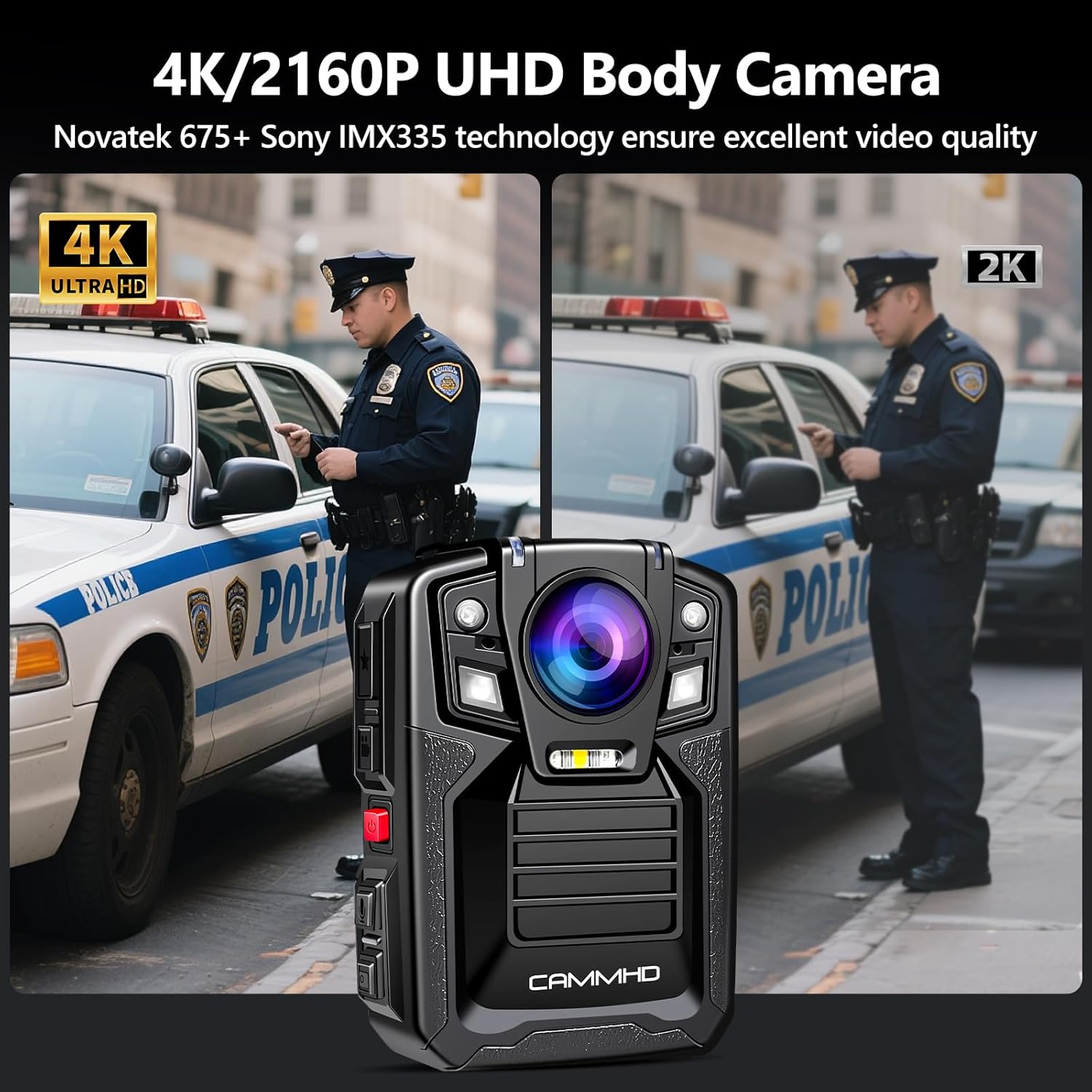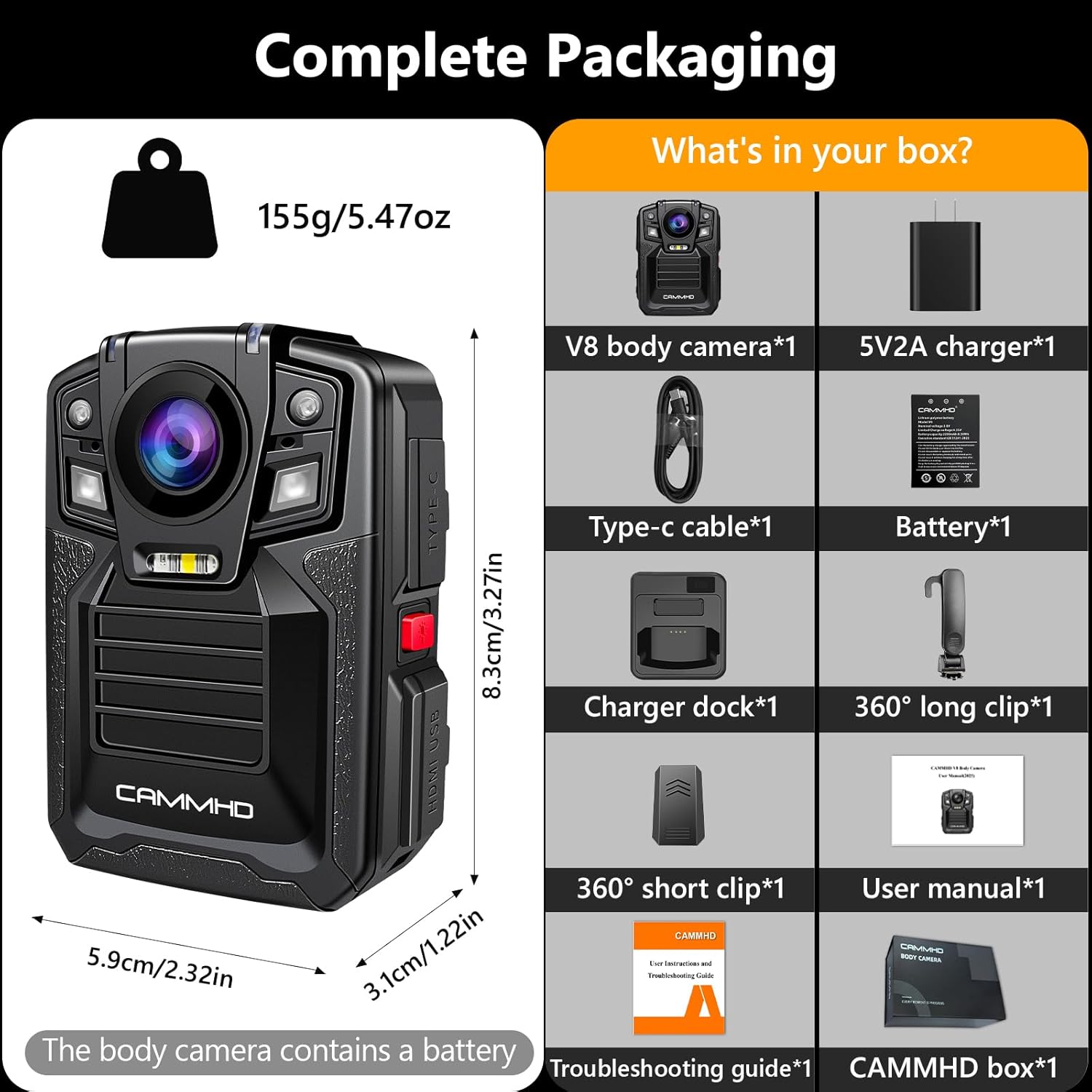 CAMMHD V8-128GB 4K Body Camera with Audio and Video Recording, 2160P Body Cam Two Battery 4400mAh Work 14H, H.265 Video Recorder, IP68 Waterproof, Night Vision Police Body Camera with Charging Dock