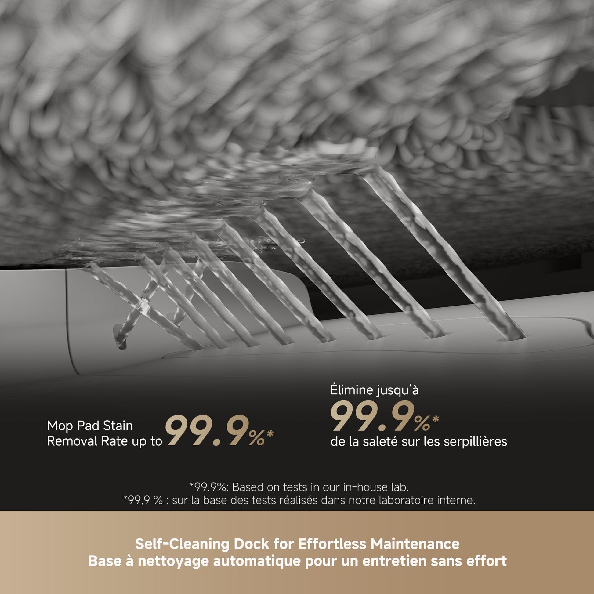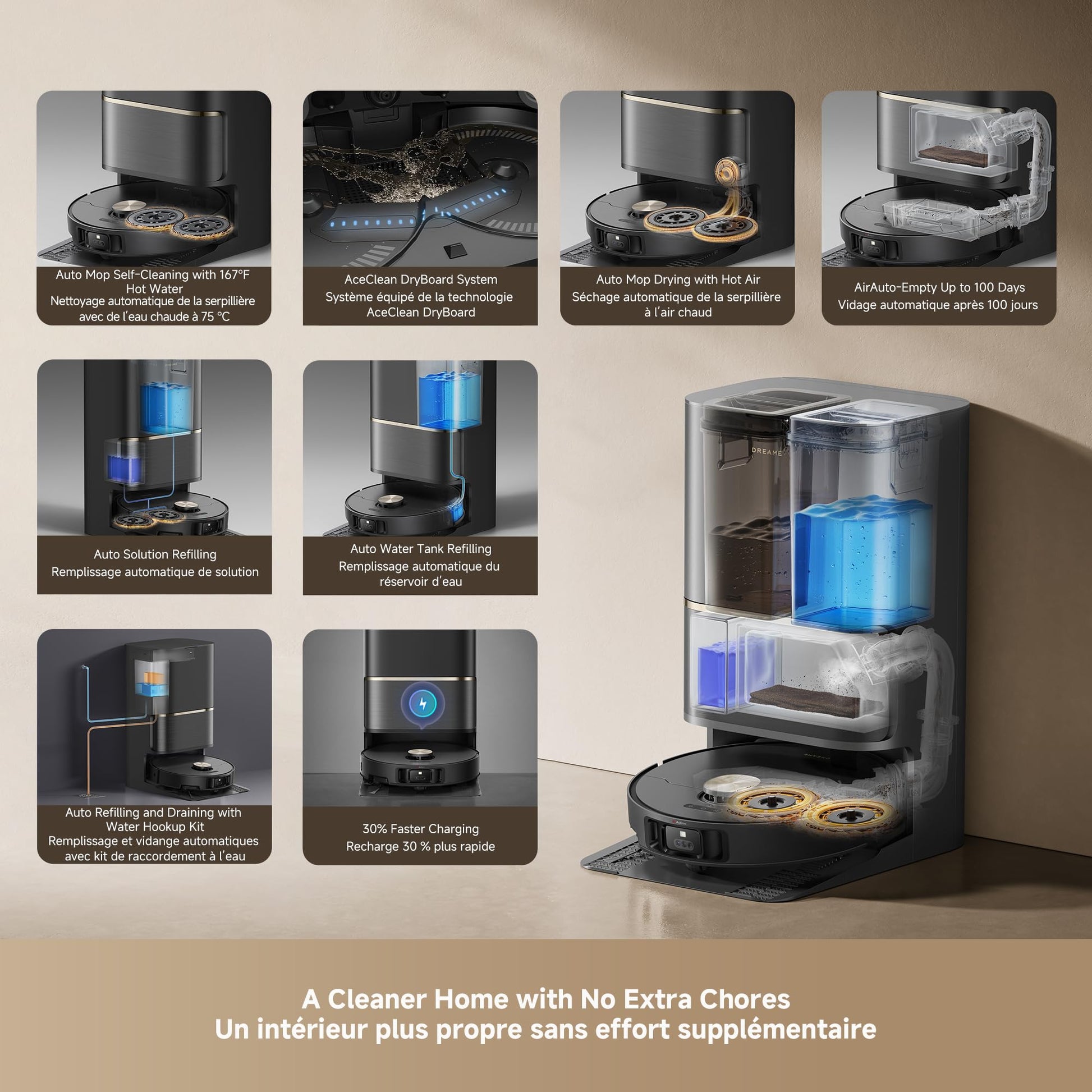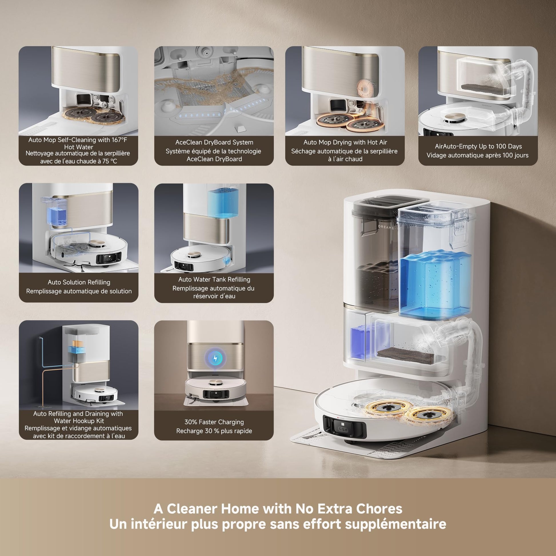- All-in-One PowerDock Convenience: Benefit from the dock's effortless maintenance. Skip manual dust bin emptying for up to 100 days, rinsing mop pads with hot water from all the dirt, or drying them. L50 Ultra also refills solution and water for mopping and auto-washes its board, creating a hands-free post-cleaning routine.