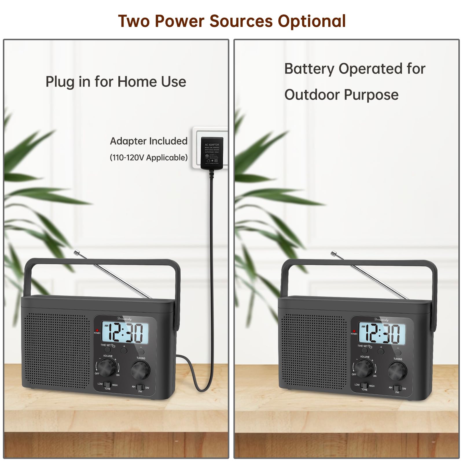 - AC Adapter or Battery Operated Radio for Home and Outdoor: the digital fm radio supports two power sources, either plug in the radio for indoor use while in kitchen, doing cleaning, cooking or reading without having to depend on batteries in stock, or using 4 AA alkaline batteries (not included) while working outside, doing yard work, walking the dogs, camping, hiking, beaching, drive in theaters etc. During power cut, the battery radio helps to let go of boredom and isolation, while emergency like bad storm or hurricane strikes, the small portable radio keeps you connected with the ourside world.