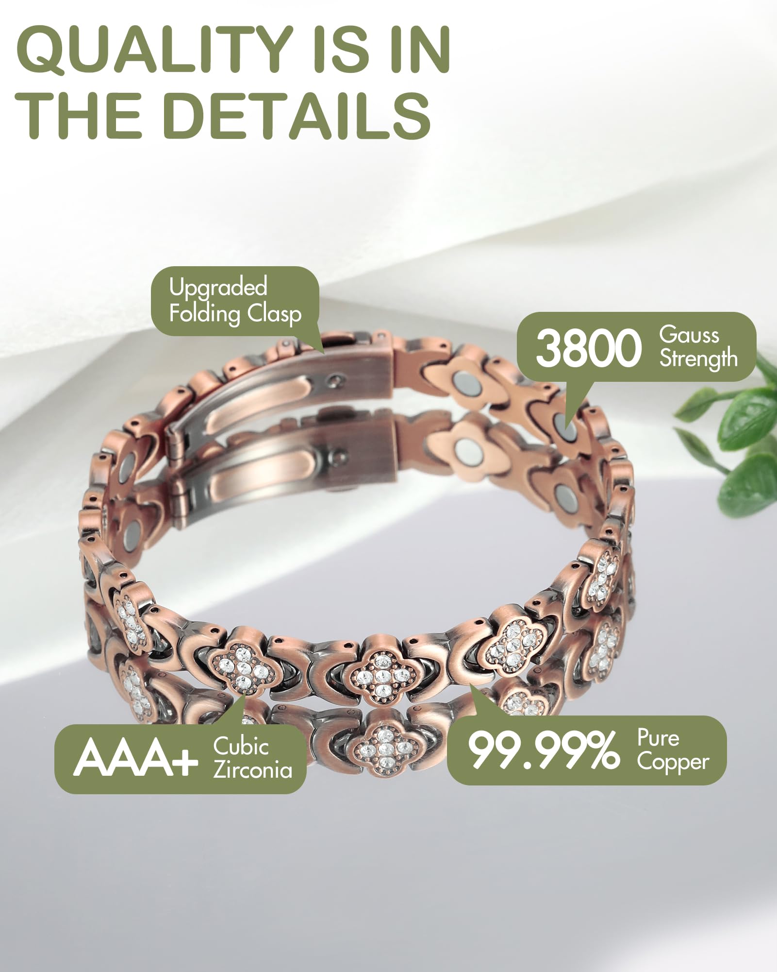 Feraco Pure Copper Bracelets for Women, Ultra Strength Magnetic Therapy Bracelet for Pain Relief with Neodymium Magnets & Sparkling Cubic Zirconia, Adjustable, Infinite Clover Jewelry
